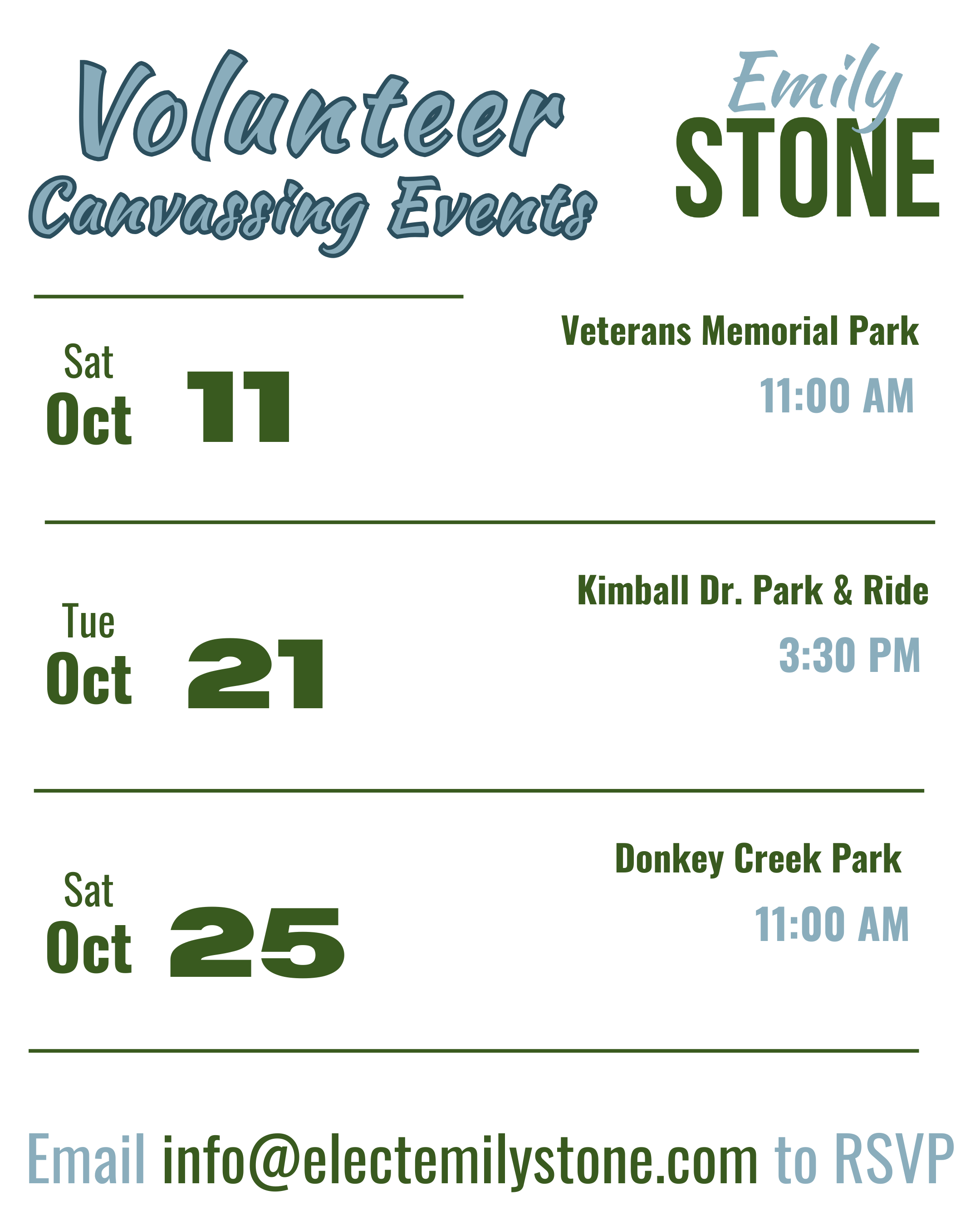 Opportunities to support Emily Stone in her race for Gig Harbor City Council.